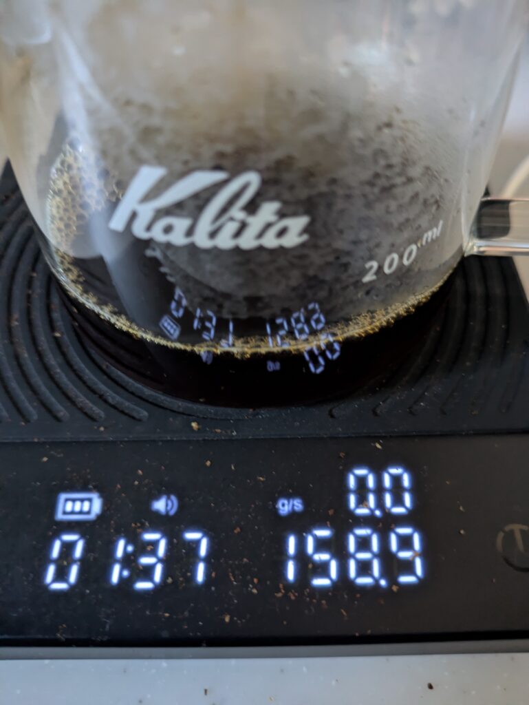 豆の量は今回16.4gで、銘柄はコロンビア、エチオピア、ブラジルのブレンドです。
