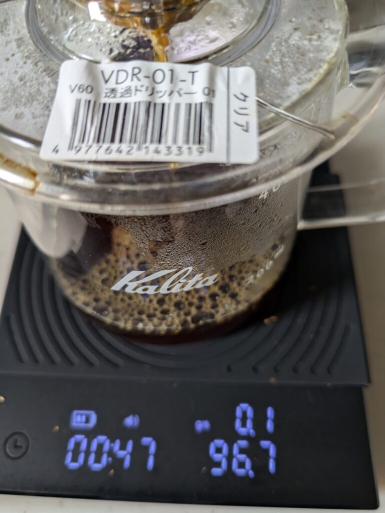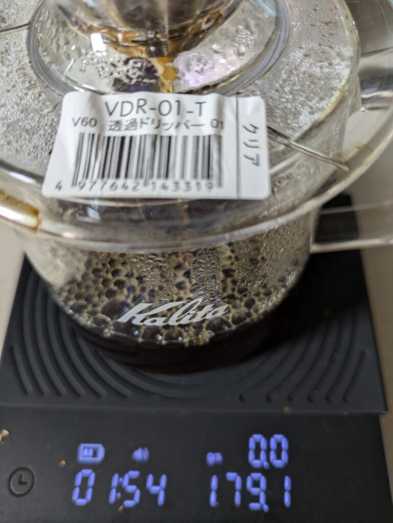 一投目です。ドリッパーの粉全体にうまく湯を注げず、やや多めの投入量となってしまいます。