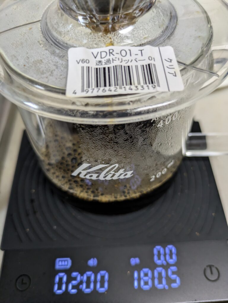 ここでも20ml注ぐ予定でしたが、ドリッパーの粉の泡立ちが止まないため、湯量を追加する判断をいたしました。