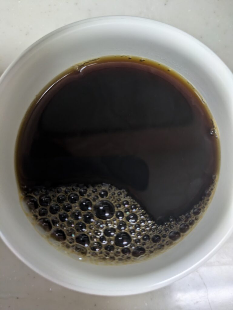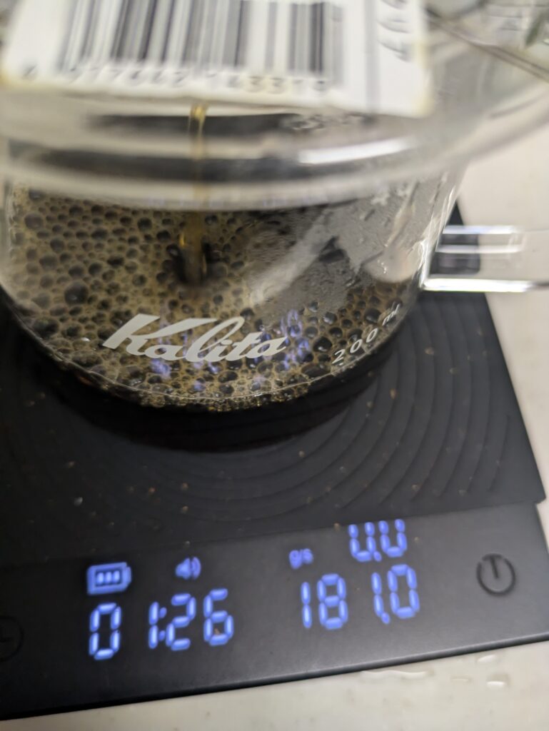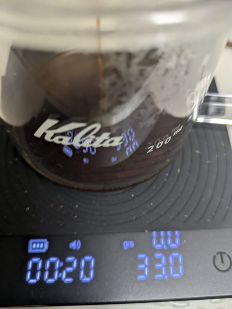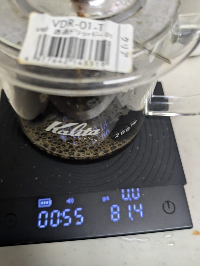 ドリッパーの粉がハンバーグ状に膨らんだあと、ぽこぽことガスが生じたため、すこし多くお湯を注ぎました。